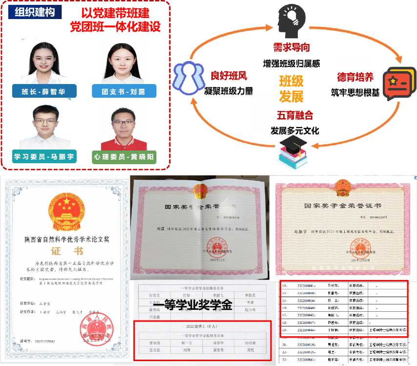 班级建设:22102-1班由23名博士生组成,其中男生19名,女生4名,党员人数16名,占总人数的69.57%。班级始终遵循“以培养‘总师型’人才为目标”的班级理念,倡导以党建带班建,党团班一体化建设,注重组织建构,适时调整班干架构。发挥班长在集体建设中先锋作用,增强班级归属感,同时发挥团支书引领作用,筑牢思想根基,并以特色活动为抓手,发展多元文化,最终成为一个有凝聚力的班集体。在过去一年里,他们硕果累累。班级课程加权平均分,89.35分,位于年级第一;综合测评也位于年级第一,国家奖学金3人次、西北工业大学一等学业奖学金13人次、省级优秀学生干部1人次,陕西省自然科学优秀学术论文奖1人次。