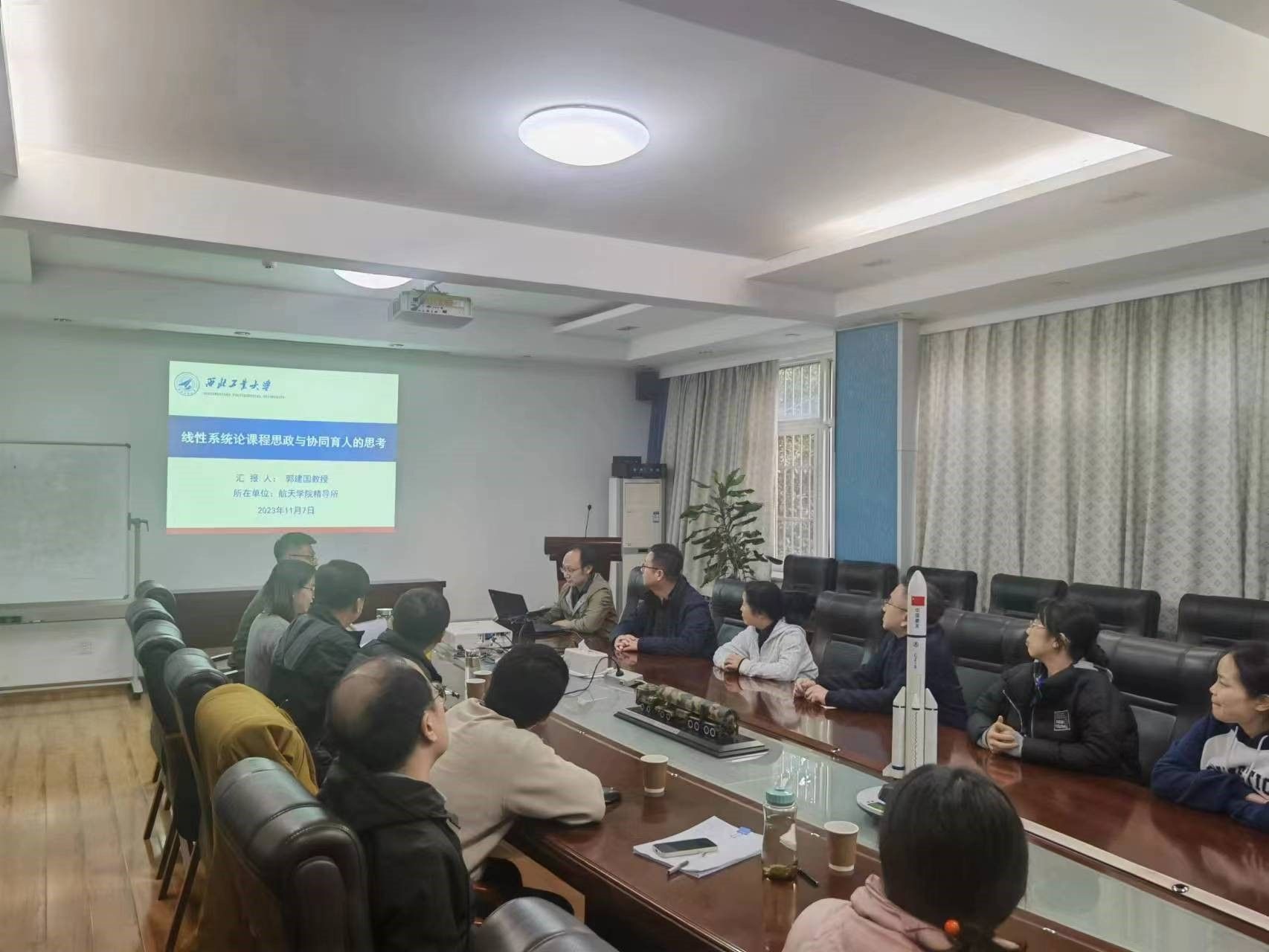 精确制导与控制研究所所长郭建国教授、党支部书记卢晓东和教职工15人参加了交流会和主题党课活动。首先,郭建国教授以“线性系统理论课程思政与协同育人”为主题讲述了在“线性系统理论”课程教学中所采用的课程思政方法,并总结了协同育人的理念与措施。“线性系统理论”课程是我校控制类公共专业基础课程,该课程和教学团队2022年分别获西北工业大学课程思政示范课程和课程思政团队。郭建国教授以家国情怀、责任担当、思辨能力培养和航天工程事例等四个维度,详细介绍了线性系统理论课程开展教学思政的相关事例和融入课程的教学方法。同时也从课程育人、实验育人和实践育人等方面介绍了教学团队在协同育人方面的特色做法和取得的成绩。随后,参会党员和教师针对课程思政和立德树人等方面进行充分的交流和讨论。
