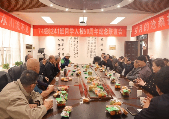 10月13日74级8241班16名同学从沈阳、北京、上海、武汉、贵阳、襄阳和河南新县等地集中返校并召开了师生座谈会。会议室正面高挂着横幅: “74级8241班入校50周年纪念联谊会”,两侧一幅是“同学之间的情谊如溪水川流不息”,一幅是“岁月的沧桑抹不去校园的回忆”;表达了同学们的真实感受和热切期盼。会议室后面悬挂“感谢母校,感恩老师,感念同学,感悟人生”的横幅,充分表达了同学积极参加这次联谊会的真正目的。成人直播